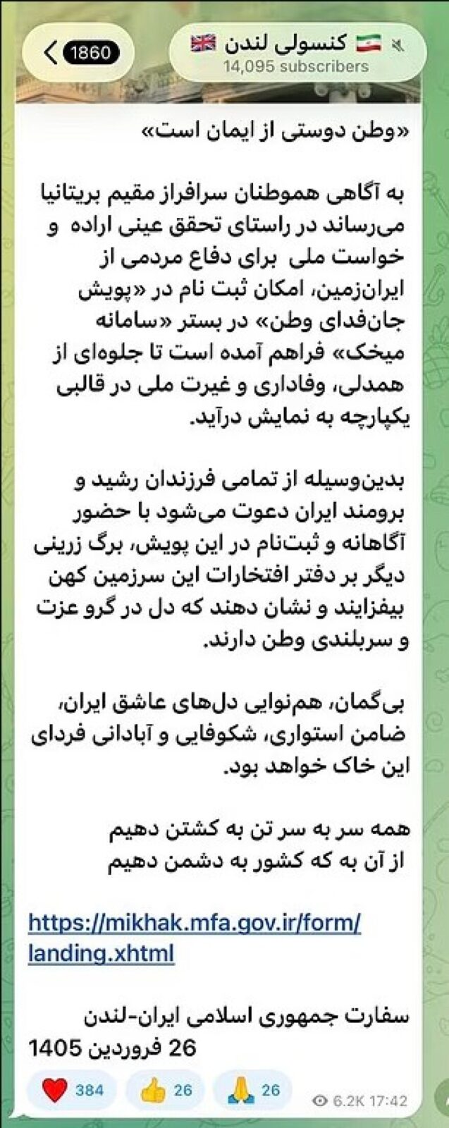Στο μήνυμα γίνεται έκκληση προς «όλα τα γενναία και ευγενή παιδιά του Ιράν» που διαθέτουν «επιθυμία για την υπεράσπιση της πατρίδας» να εκδηλώσουν ενδιαφέρον, ως ένδειξη «αλληλεγγύης, πίστης και εθνικού ζήλου».