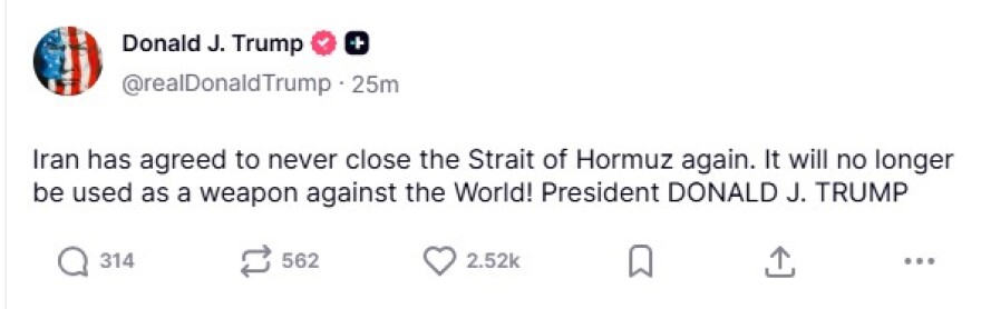 Σε άλλη ανάρτησή του, ο Τραμπ ισχυρίστηκε ότι το Ιράν αφαιρεί όλες τις θαλάσσιες νάρκες του από τα Στενά του Ορμούζ με τη βοήθεια των ΗΠΑ, χωρίς να δώσει λεπτομέρειες: «Το Ιράν, με τη βοήθεια των ΗΠΑ, έχει αφαιρέσει ή βρίσκεται στη διαδικασία αφαίρεσης…