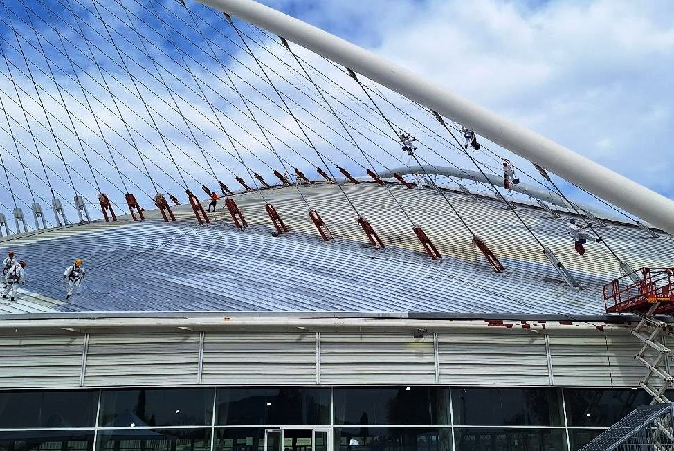 Στο Κεντρικό Στάδιο, βρίσκονται σε πλήρη εξέλιξη οι εργασίες υδροβολής/ειδικής έκπλυσης και εφαρμογής του αντιοξειδωτικού συστήματος στο Βορειοανατολικό και Νοτιοδυτικό Στέγαστρο (Φάσεις Α’ και Β’), καθώς και στους αντίστοιχους αναρτήρες. Παράλληλα, εκτελούνται καθαρισμοί και εφαρμογή στρώσης primer στο εσωτερικό των τόξων, ενώ συνεχίζονται οι εργασίες βαφής για την αποκατάσταση του συστήματος αντιδιαβρωτικής προστασίας των μεταλλικών κατασκευών ασφαλείας πέριξ των θυρίδων εισόδου του γηπέδου.