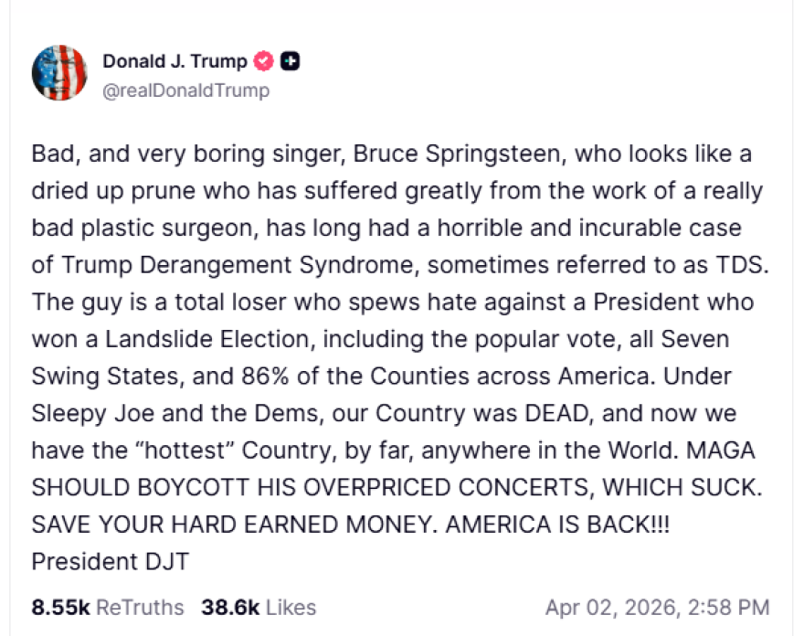 «Ο Μπρους Σπρίνγκστιν, αυτός ο κακός και πολύ βαρετός τραγουδιστής, που μοιάζει με ένα ξερό δαμάσκηνο και που εμφανώς φέρει τα σημάδια ενός αποτυχημένου πλαστικού χειρουργού, πάσχει εδώ και καιρό από ένα φρικτό και ανίατο σύνδρομο διαταραχής κατά του Τραμπ», έγραψε ο πρόεδρος των ΗΠΑ σε μήνυμά του που δημοσιεύτηκε στην πλατφόρμα του Truth Social.