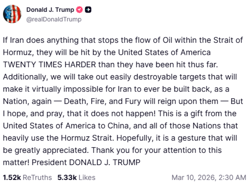 «Αν το Ιράν κάνει οτιδήποτε που θα σταματήσει τη ροή πετρελαίου μέσα στα Στενά του Ορμούζ, θα πληγεί από τις Ηνωμένες Πολιτείες της Αμερικής είκοσι φορές σκληρότερα από ό,τι έχει πληγεί μέχρι τώρα».